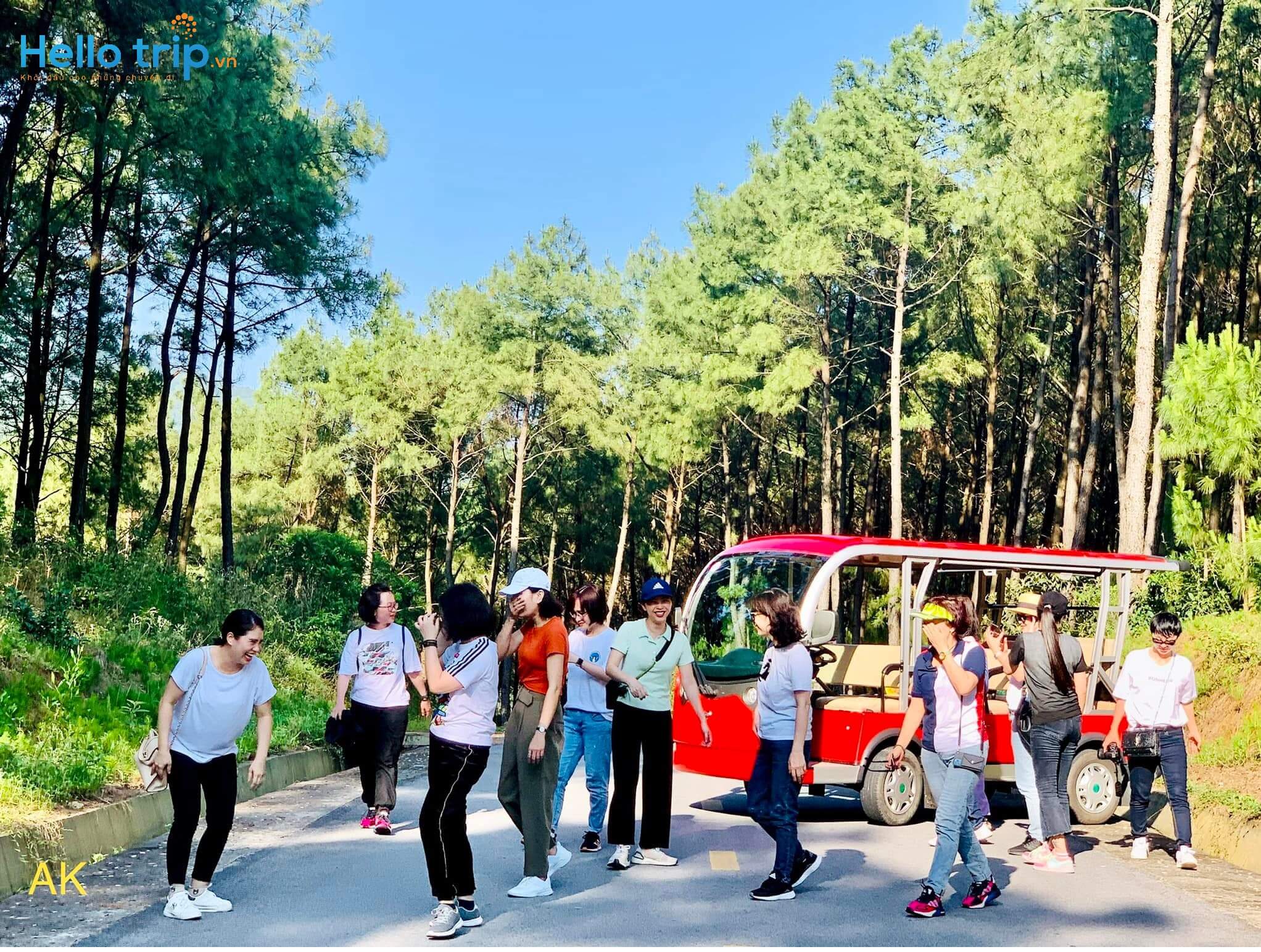 09h00 Đến chân núi Hồng Lĩnh đoàn sẽ dừng chân tại điểm nghỉ thuộc văn phòng Hello Trip Việt Nam ngay tại khu vực đón khách. Sau đó quý khách lên xe điện để di chuyển theo cung đường ven núi đến chân miếu Cô. Dọc được Quý khách sẽ được trải nghiệm đi dưới tán rừng thông xanh mát được mạnh danh Đà Lạt. Thảm thực vậy xung quang cũng rất phòng phú và đa dạng. "Tour du lịch hà tĩnh".